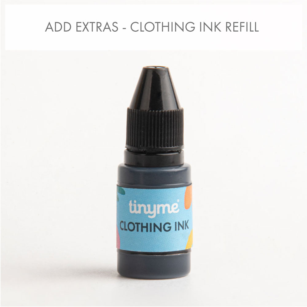 Clothing Ink Refill If your kid has way too much clothing (or you triple stamp every piece of clothing for "insurance"), your Clothing Name Stamp impression may lose its boldness. Don't throw away your stamp though! Simply refill the Clothing Name Stamp with the Clothing Ink Refill bottle and continue stamping. Each bottle contains 10mL of ink which will require more clothes than available in a department store before it's all used up. Clothing Ink Refills are available here.
