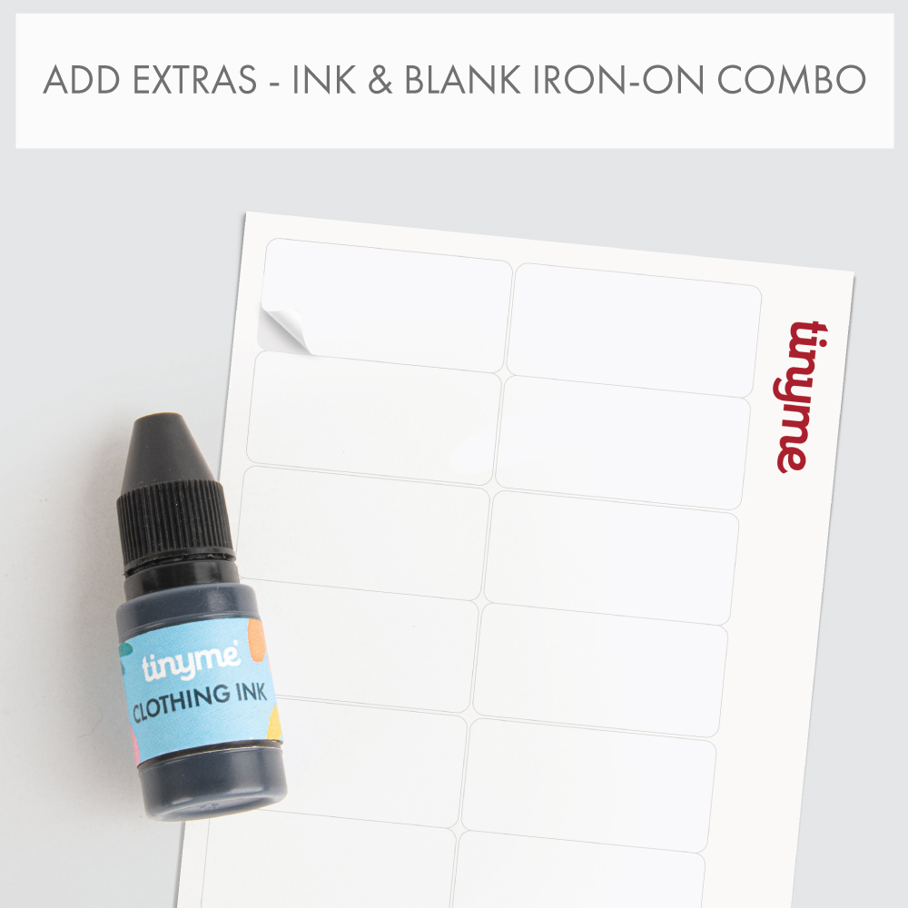Ink & Labels Bundle The ultimate prepared-person's pack with a 10mL bottle of Clothing Ink Refill and 16 Blank Iron-On Labels for your dark coloured and thin fabric clothing.