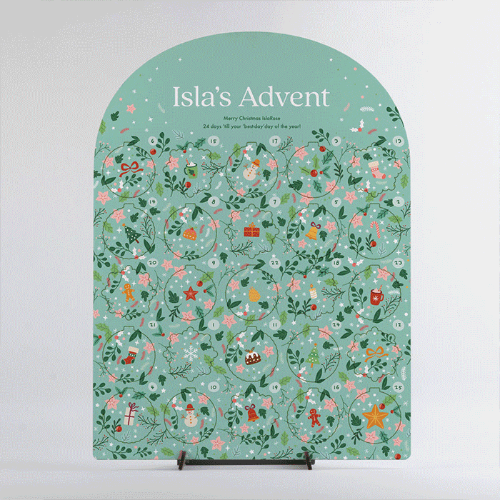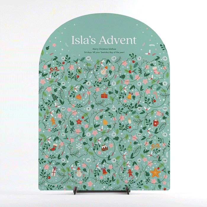 The personalized Christmas calendar can be mounted on its complimentary stand.